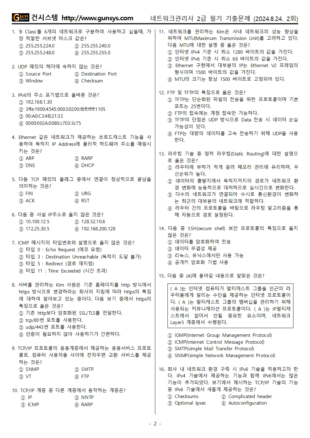 ■ 2024년 3회 네트워크관리사2급 필기 기출문제 CBT 응시, 문제 파일 내려받기 (↓)