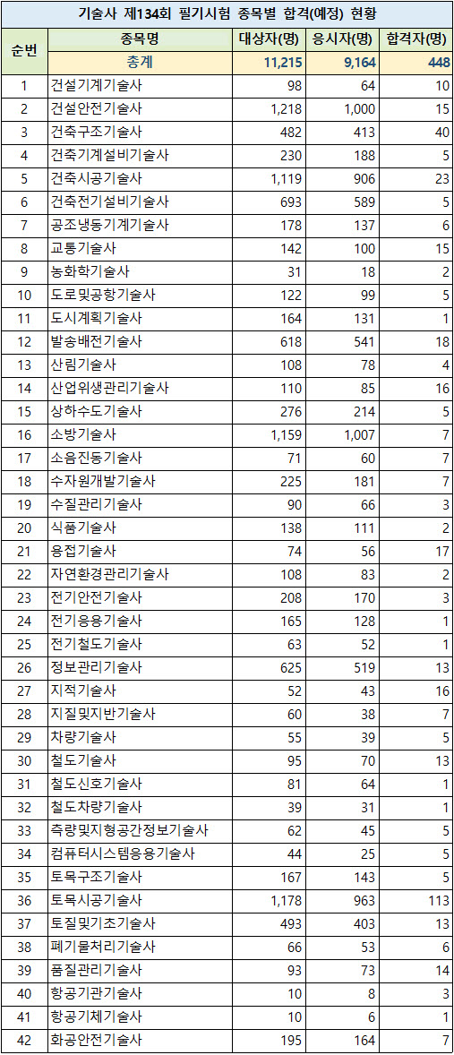한국산업인력공단 2024년 시행 134회 기술사 필기시험 종목별 현황 (응시인원, 합격인원)