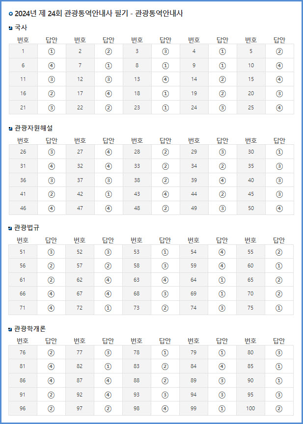2024년 한국산업인력공단 시행 24회 관광영어통역사 필기시험 가답안 (9월 7일 시행)