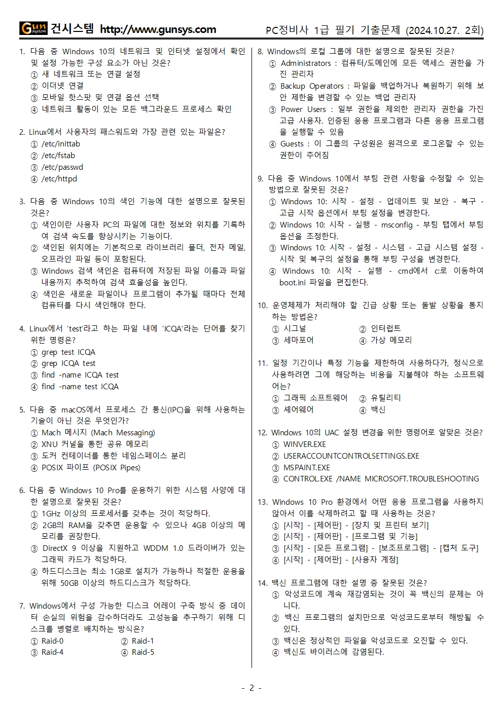 2024년 2회 PC정비사 1급 기출문제 (필기시험, 10월 27일 시행)