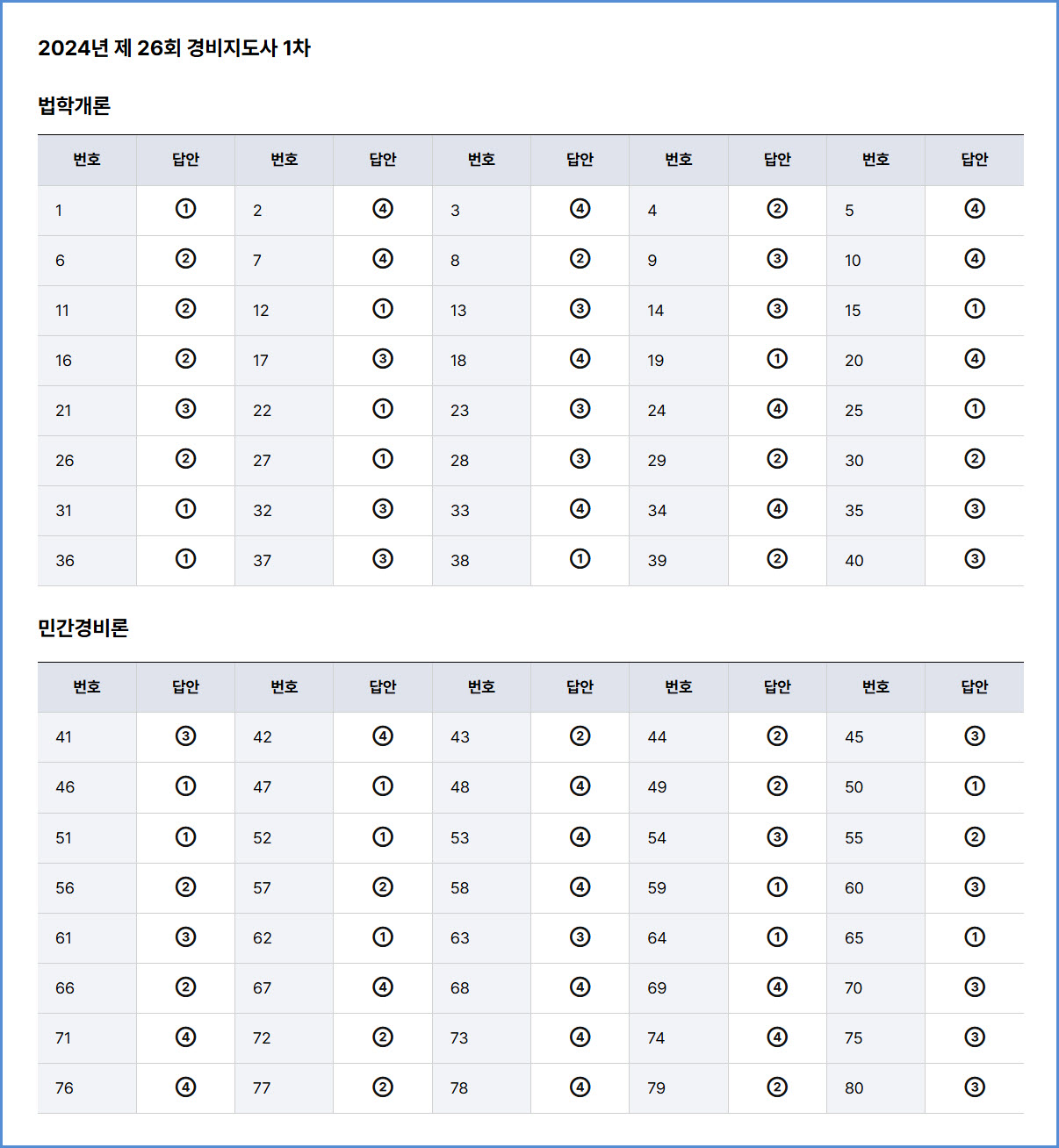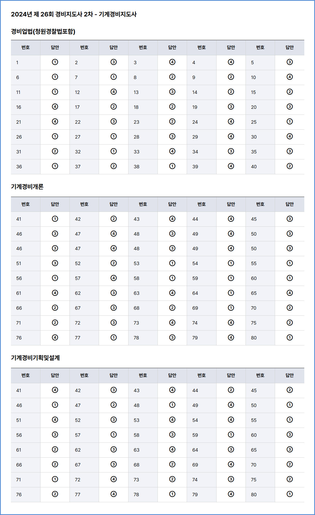 2024년 26회 경비지도사(기계) 1차, 2차 시험 가답안 출처는 자격검정 수탁 기관인 한국산업인력공단에서 운영하는 웹사이트 큐넷(q-net.or.kr)의 가답안/확정답안 게시판입니다.