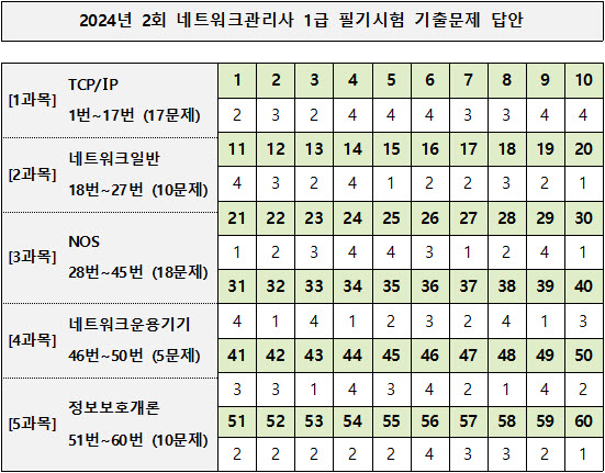 2024년 2회 네트워크관리사 1급 필기시험 확정답안, 기출문제 CBT (10월 27일 시행)