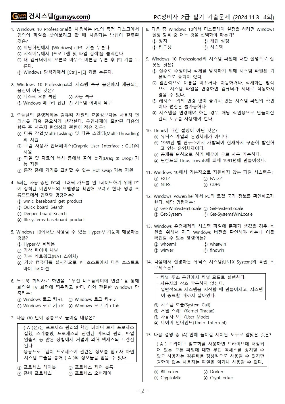 2024년 4회 PC정비사 2급 기출문제 (필기시험, 11월 3일 시행)