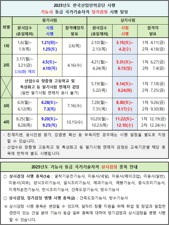 [기타참고] 2025년 한국산업인력공단 시행 기능사 정기검정 일정 및 상시검정 종목 (↓)