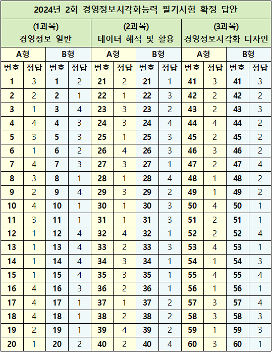 2024년 2회 경영정보시각화능력 정기검정 필기시험은 11월 30일 시행되었고, 첨부한 가답안 파일 출처는 자격검정 시행기관인 대한상공회의소에서 운영하는 자격평가사업단 웹사이트(license.korcham.net)입니다.