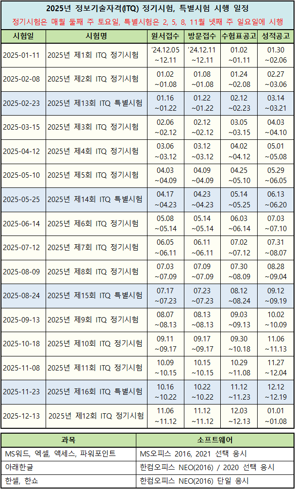 2025년 ITQ 정기와 특별시험 일정 첨부 파일과 일정표는 KPC 자격 웹사이트의 시험일정 웹페이지에 게재된 내용을 편집하여 작성하였습니다.