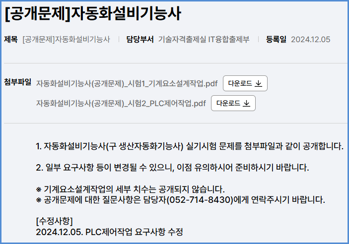 | 2025년부터 적용되는 자동화설비산업기사 실기시험 공개 문제 내려받기 (큐넷 자료실) (0) | 2024.12.21 |