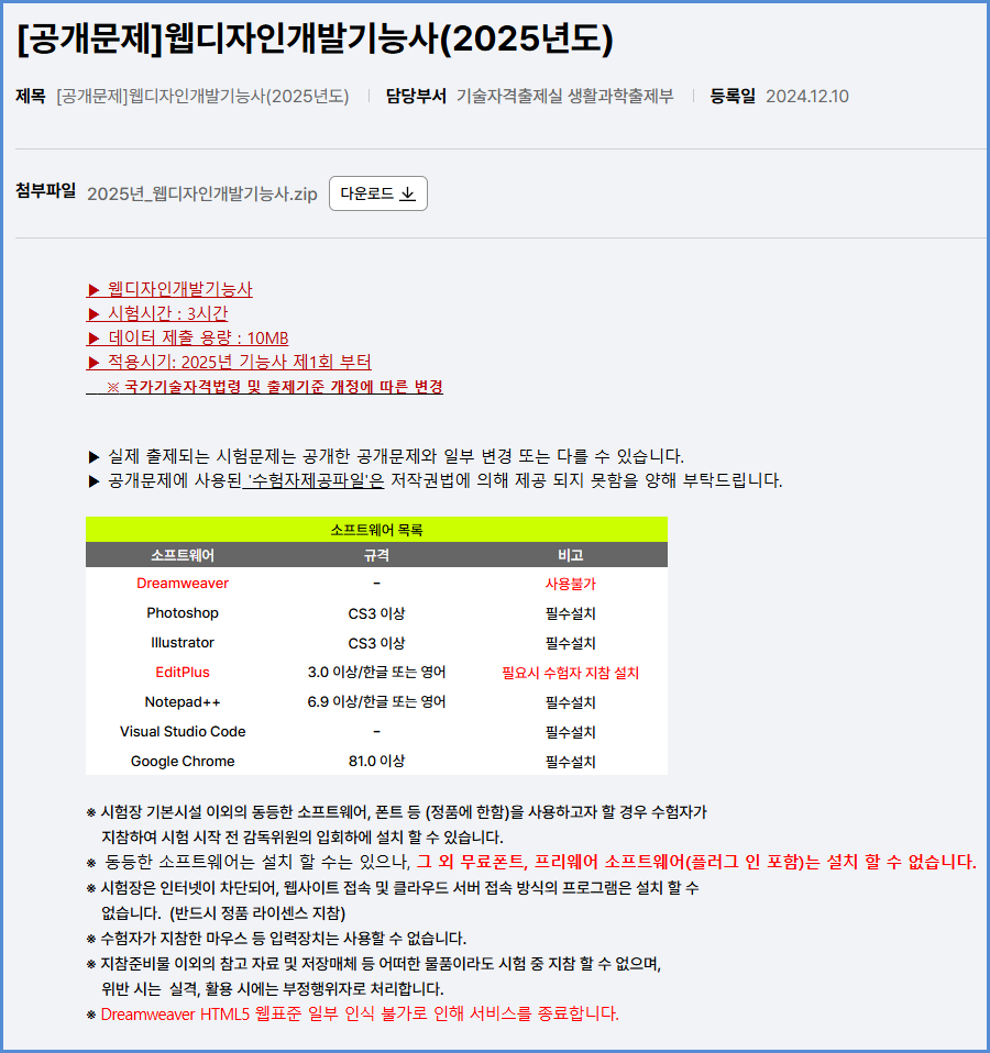 2025년부터 적용되는 웹디자인개발기능사 실기시험 공개 문제 내려받기 (큐넷 자료실)