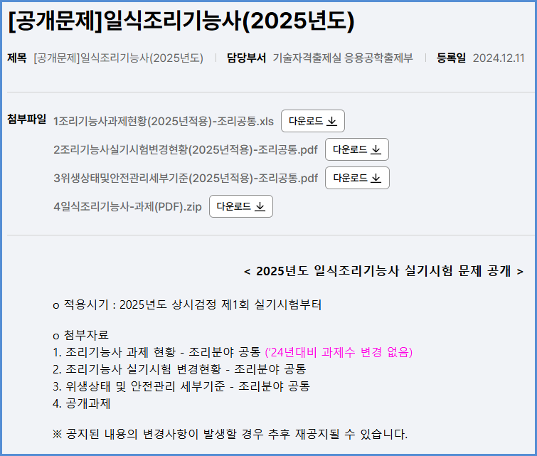 2025년부터 적용되는 일식조리기능사 실기시험 공개 문제 내려받기 (큐넷 자료실)