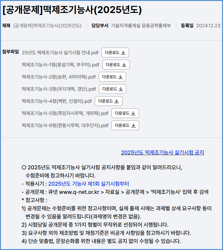 2025년도 적용 떡제조기능사 실기시험 공개 문제 내려받기 (큐넷 자료실)
