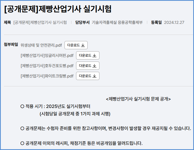 | 2025년도 적용 제과산업기사 실기시험 공개 문제 내려받기 (큐넷 자료실) (0) | 2024.12.27 |