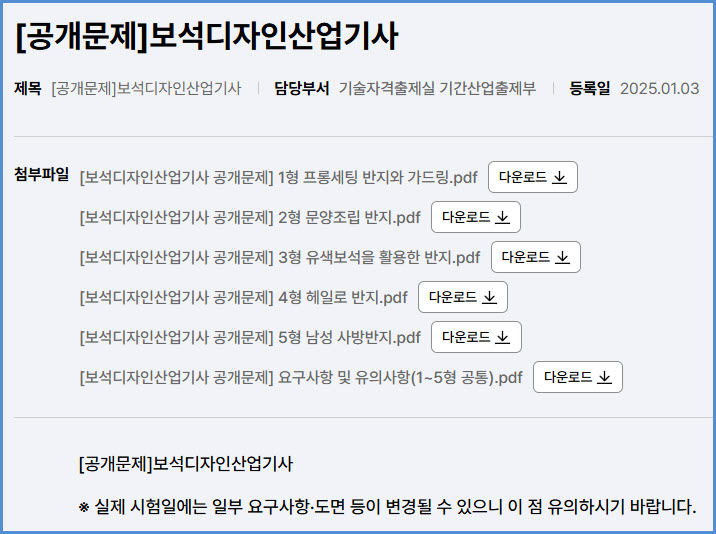 2025년도 적용 보석디자인산업기사 실기시험 공개 문제 내려받기 (큐넷 자료실)