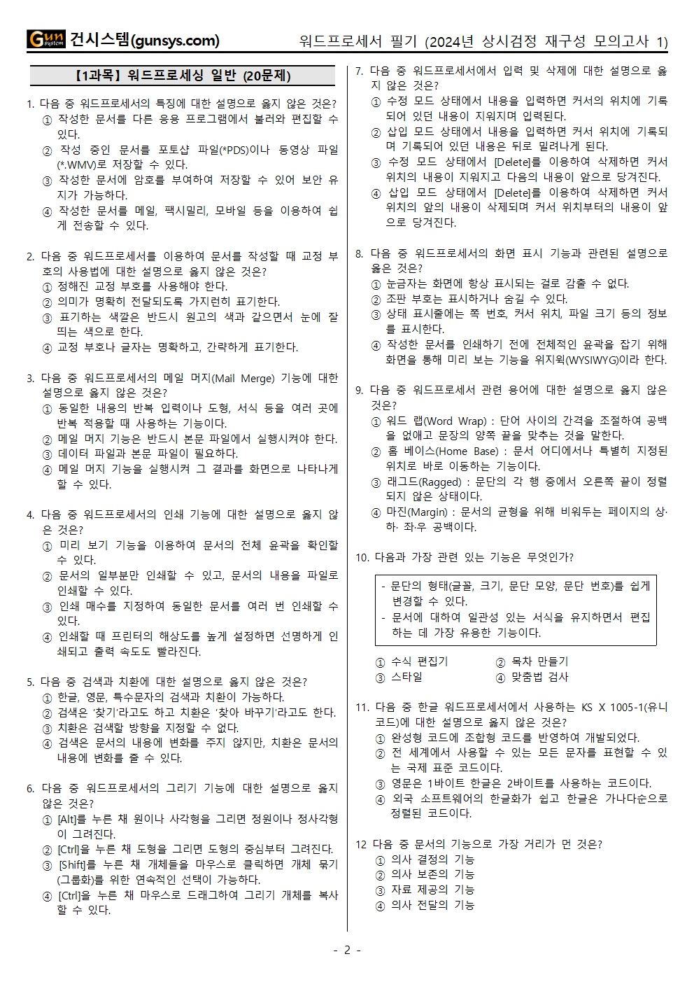 2024년 시행 워드프로세서 상시검정 필기시험 기출문제 복원 재구성 모의고사 1