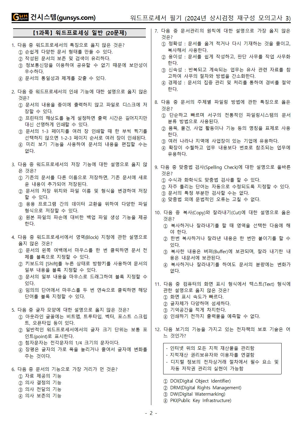 2024년 시행 워드프로세서 상시검정 필기시험 기출문제 복원 재구성 모의고사 3