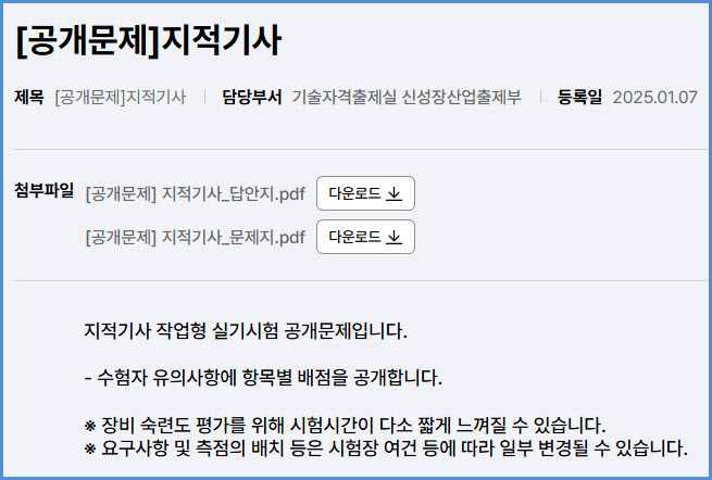 2025년도 적용 지적기사 실기시험 공개 문제 내려받기 (큐넷 자료실)