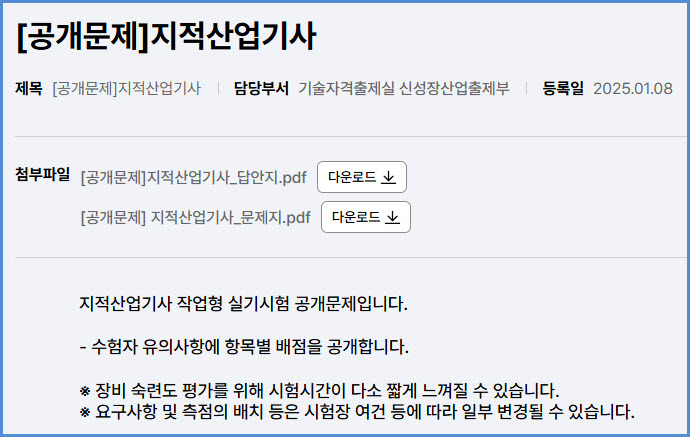 2025년도 적용 지적산업기사 실기시험 공개 문제 내려받기 (큐넷 자료실)