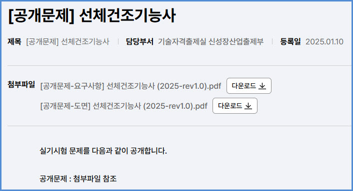 2025년도 적용 선체건조기능사 실기시험 공개 문제 내려받기 (큐넷 자료실)