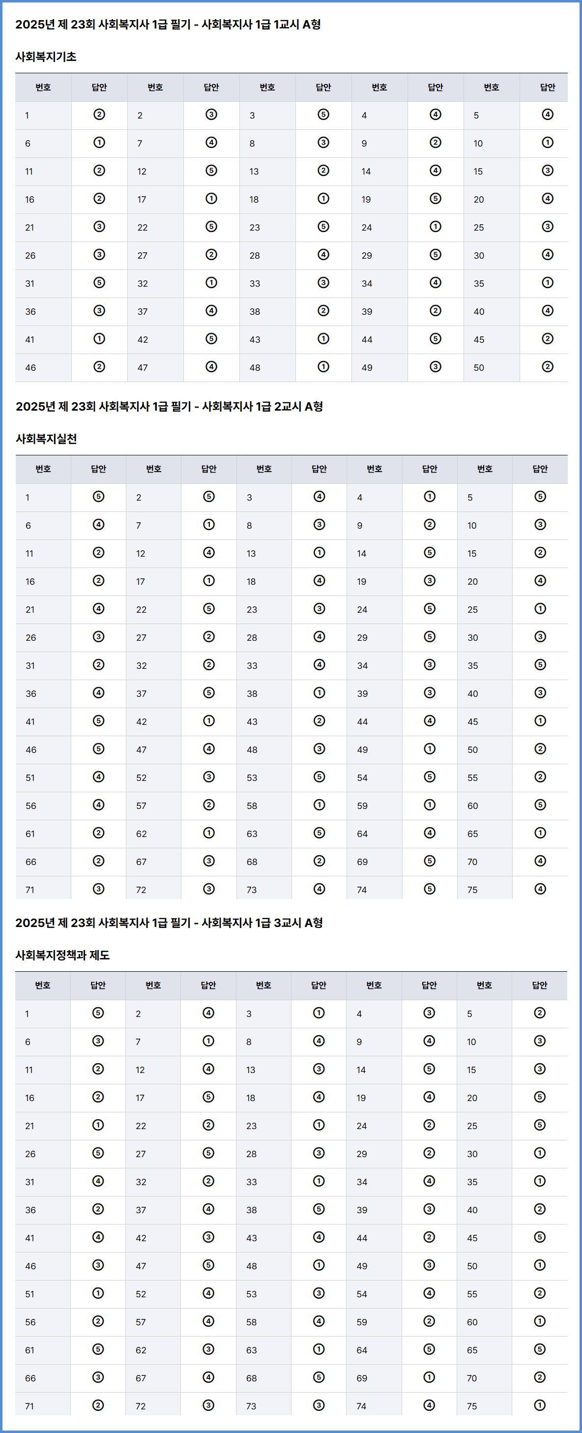 2025년 한국산업인력공단 시행 23회 사회복지사1급 자격시험 가답안 (1월 11일 시행)