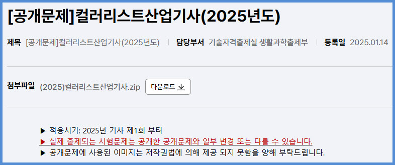 2025년도 적용 컬러리스트산업기사 실기시험 공개 문제 내려받기 (큐넷 자료실)
