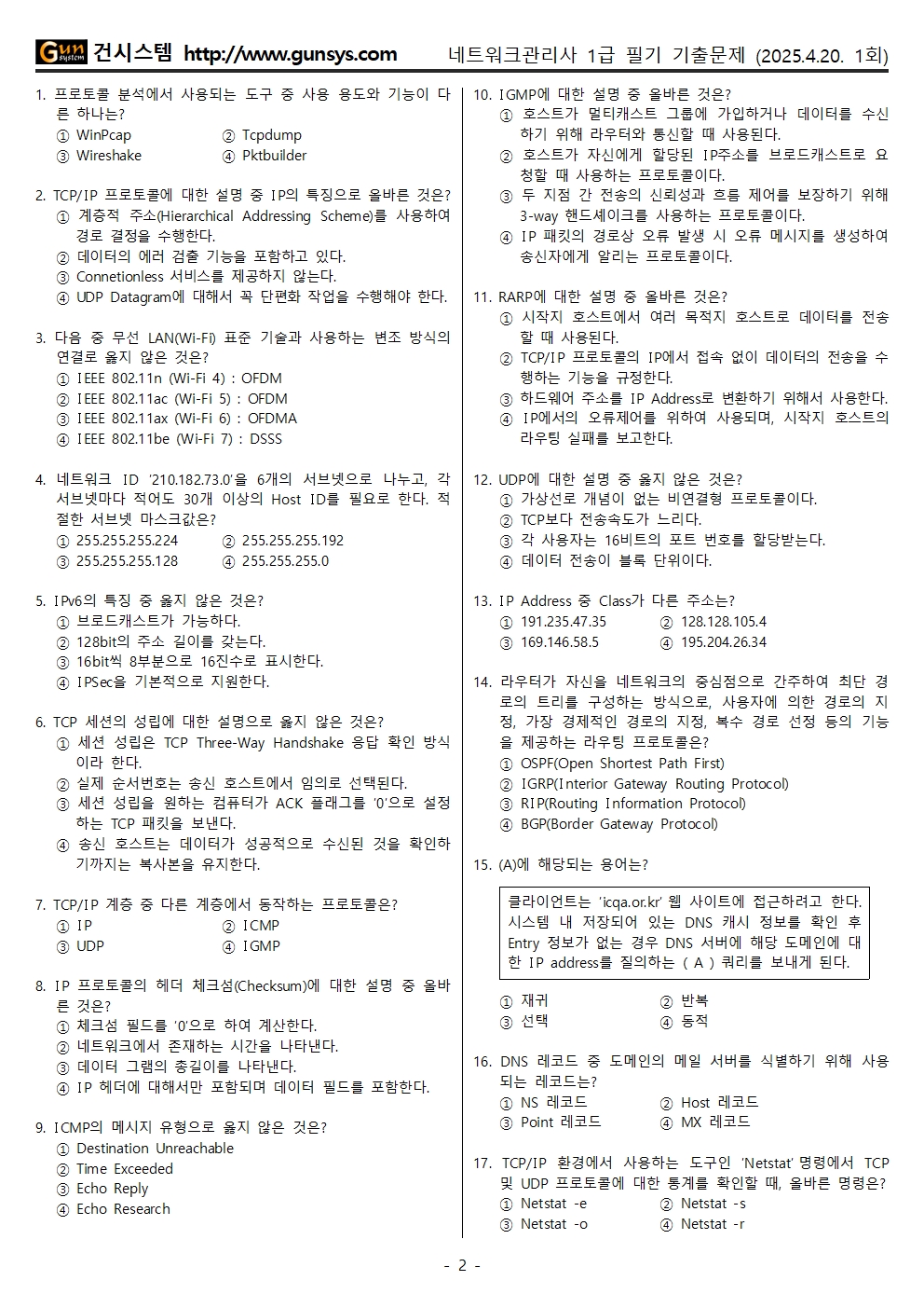 ■ 2025년 1회 네트워크관리사 1급 필기 기출문제 CBT 응시, 문제 파일 내려받기 (↓)