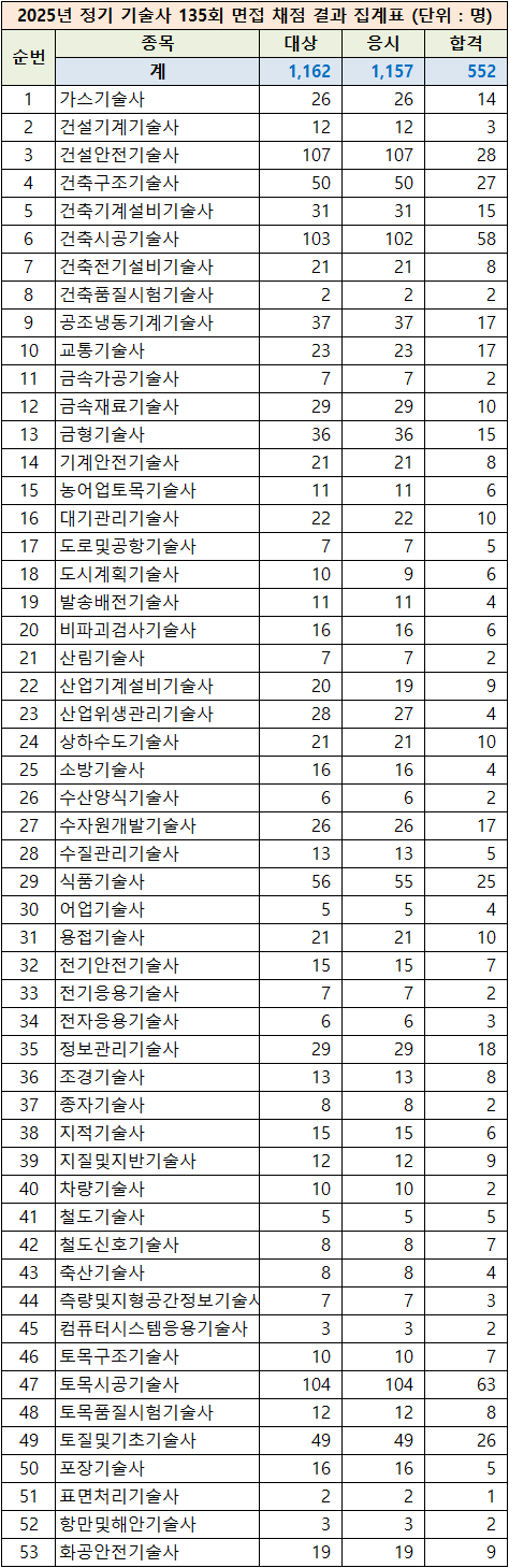 한국산업인력공단 2025년 시행 135회 기술사 면접시험 종목별 현황 (응시인원, 합격인원)