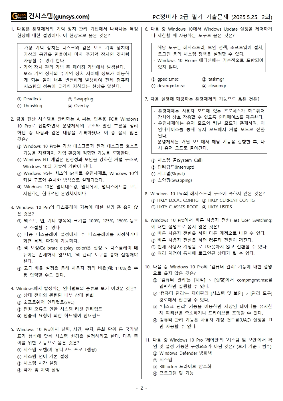 2025년 2회 PC정비사 2급 기출문제 (필기시험, 5월 25일 시행)