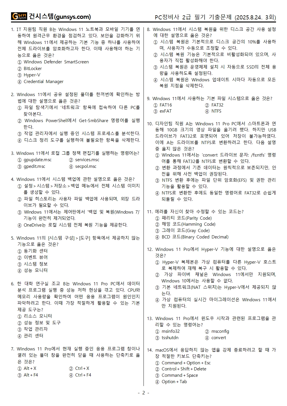 2025년 3회 PC정비사 2급 기출문제 (필기시험, 8월 24일 시행)