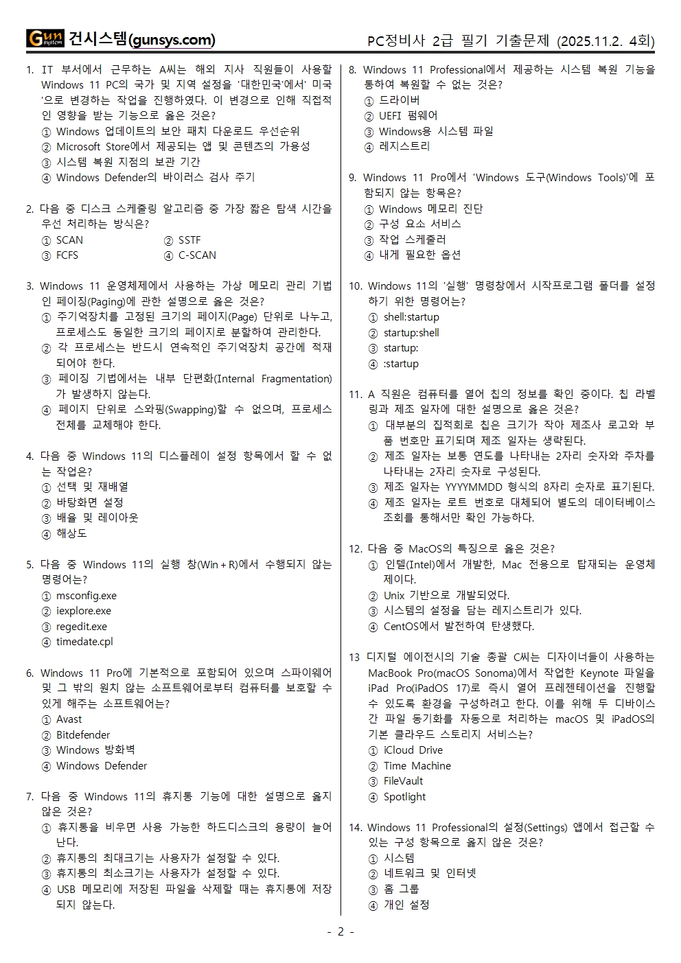 2025년 1회 PC정비사 2급 기출문제 (필기시험, 11월 2일 시행)