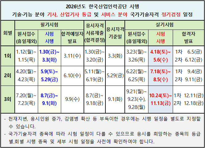 2026년 한국산업인력공단 시행 기사, 산업기사, 서비스 분야 국가기술자격검정 시행 일정