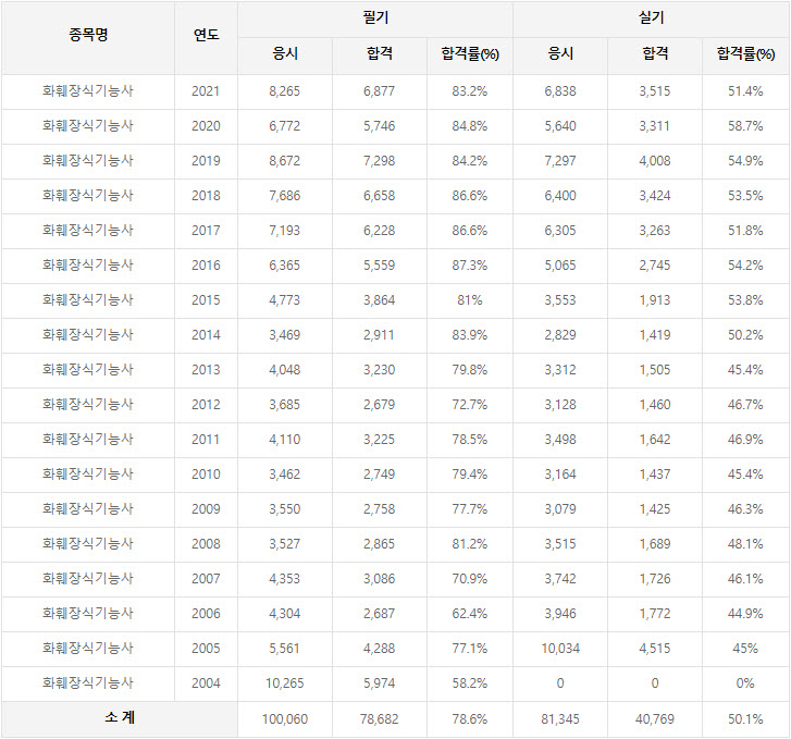 2021년까지 시행한 화훼장식기능사 연도별 필기와 실기시험 자격검정 현황(응시인원, 합격인원, 합격률) 자료 출처는 한국산업인력공단에서 운영하는 웹사이트 큐넷(q-net.or.kr)입니다.