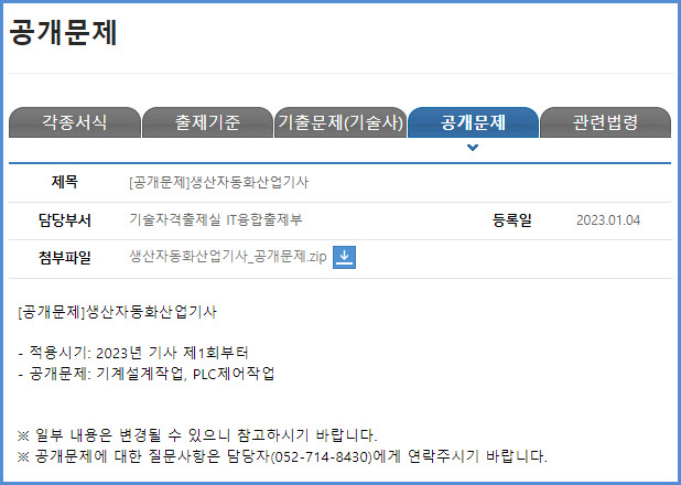생산자동화산업기사 자격검정 수탁 기관인 한국산업인력공단에서는 2023년 1월 4일 운영 중인 웹사이트 큐넷의 공개문제 자료실에 2023년도 생산자동화산업기사 실기시험 공개 문제를 등록하였습니다.