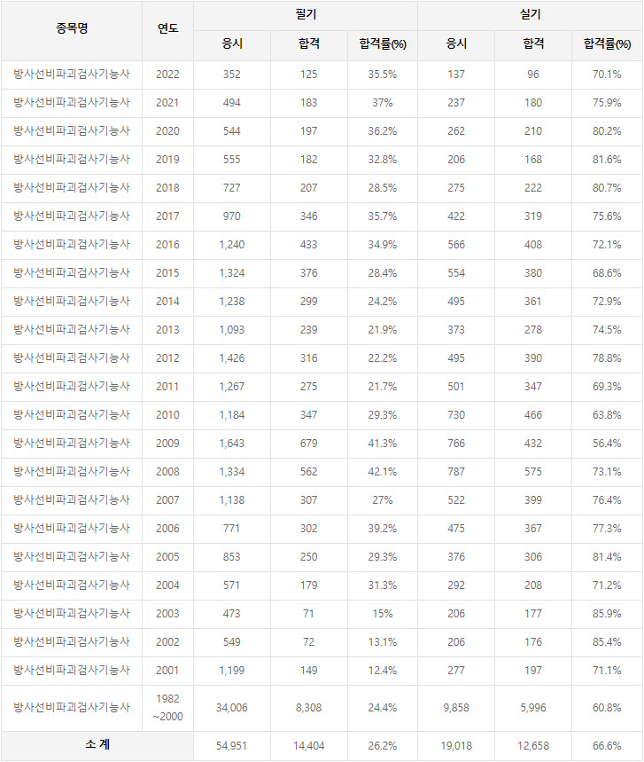 2022년까지 시행한 방사선비파괴검사기능사 연도별 필기와 실기시험 자격검정 현황(응시인원, 합격인원, 합격률) 자료 출처는 한국산업인력공단에서 운영하는 웹사이트 큐넷(q-net.or.kr)입니다.
