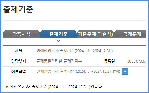 2024년도 적용되는 인쇄산업기사 필기시험과 실기시험 출제기준은 자격검정 수탁 시행기관인 한국산업인력공단에서 운영하는 웹사이트 큐넷(q-net.or.kr)의 출제기준 자료실에서 가져온 첨부 파일을 참고하시기 바랍니다.