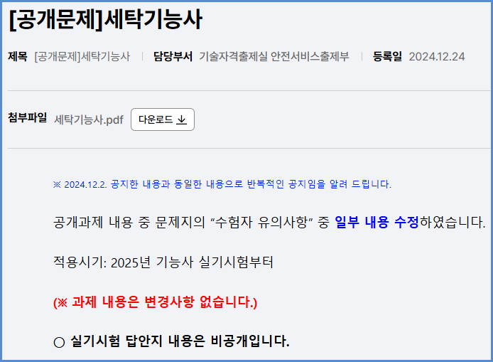 2025년도 적용 세탁기능사 실기시험 공개 문제 내려받기 (큐넷 자료실)